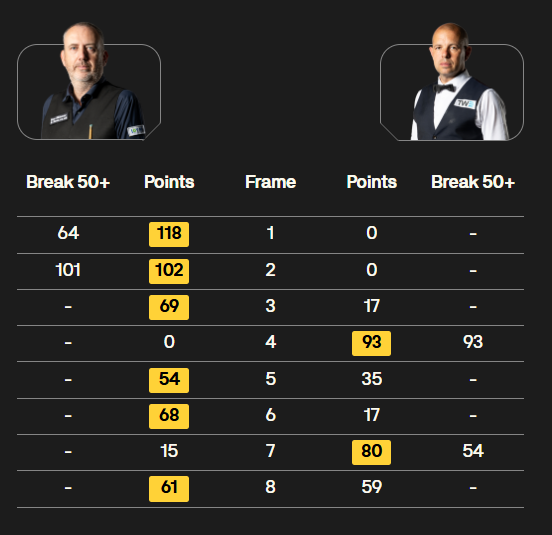 周跃龙毫无招架之力,特鲁姆普打出一杆破百和4杆50+,6-0横扫周跃龙。