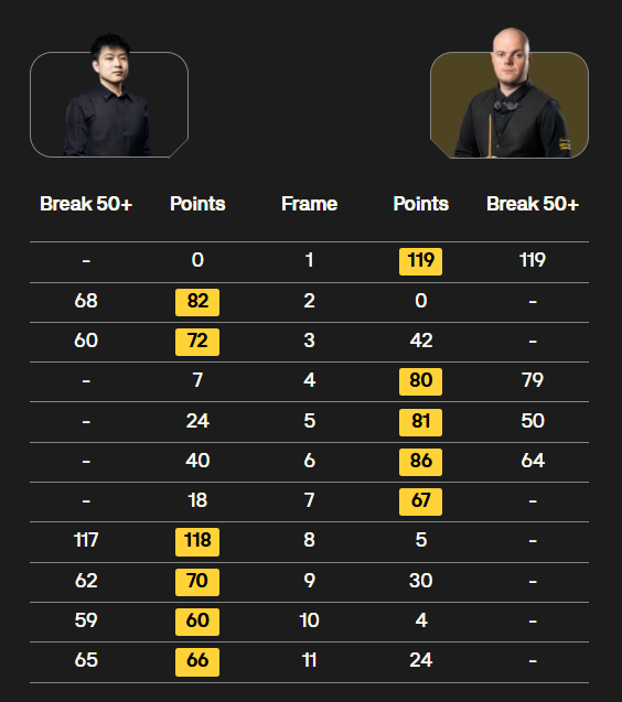 短休后,第5局,张安达单杆90分制胜,这是晚场比赛,中国球员拿到的唯一一局。此后,墨菲打出一杆81分,连赢两局,6-1大胜张安达。