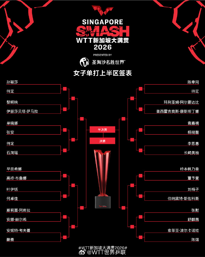 新加坡大满贯女单签表出炉,孙颖莎等7位中国球员处在上半区