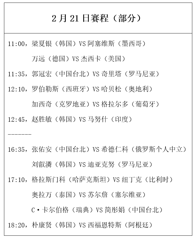 根据安排,2月21日将先结束资格赛第二轮剩余的比赛,值得关注的场次有: