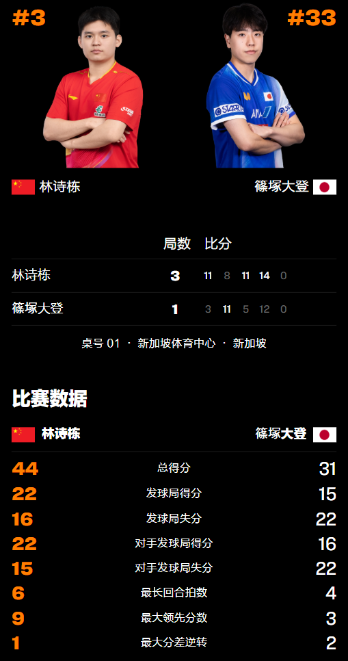比赛开始后,林诗栋在首局打得非常顺利,上来就狂轰6-0、10-1领先,随后虽然错失2个局点,但最终还是以11-3轻松先下一城。