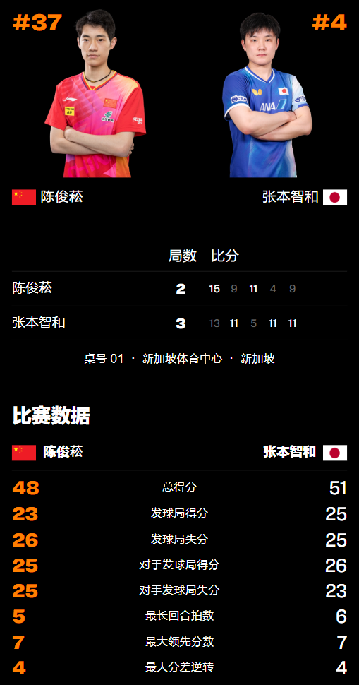 2026年2月23日,乒乓球WTT新加坡大满贯赛再次爆发中日大战,去年爆冷战胜张本智和的生胶打法小将陈俊菘再次遇到了这位国乒劲敌的阻拦,结果陈俊菘在1-0、2-1领先后错失机会,最终2-3惜败被淘汰,决胜局9-11只输2分,由此而一轮游止步男单64强,详细战况请看下文。