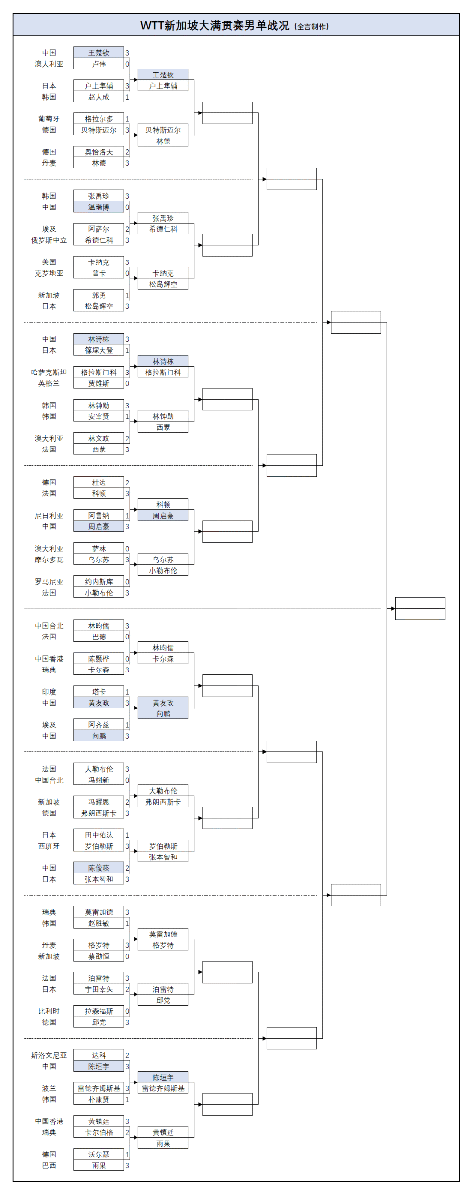 波尔卡诺娃/布鲁娜虽然是名将配对,但毕竟是跨国合作,默契度可能大打折扣,蒯曼/陈熠正常发挥的话应该能拿下;科顿有一定冲击力,周启豪不可小觑;普西霍吉奥斯和东道主球队的舒麟茜、周哲宇/蔡劭恒威胁不大,陈幸同、陈熠、林诗栋/黄友政晋级有保障。