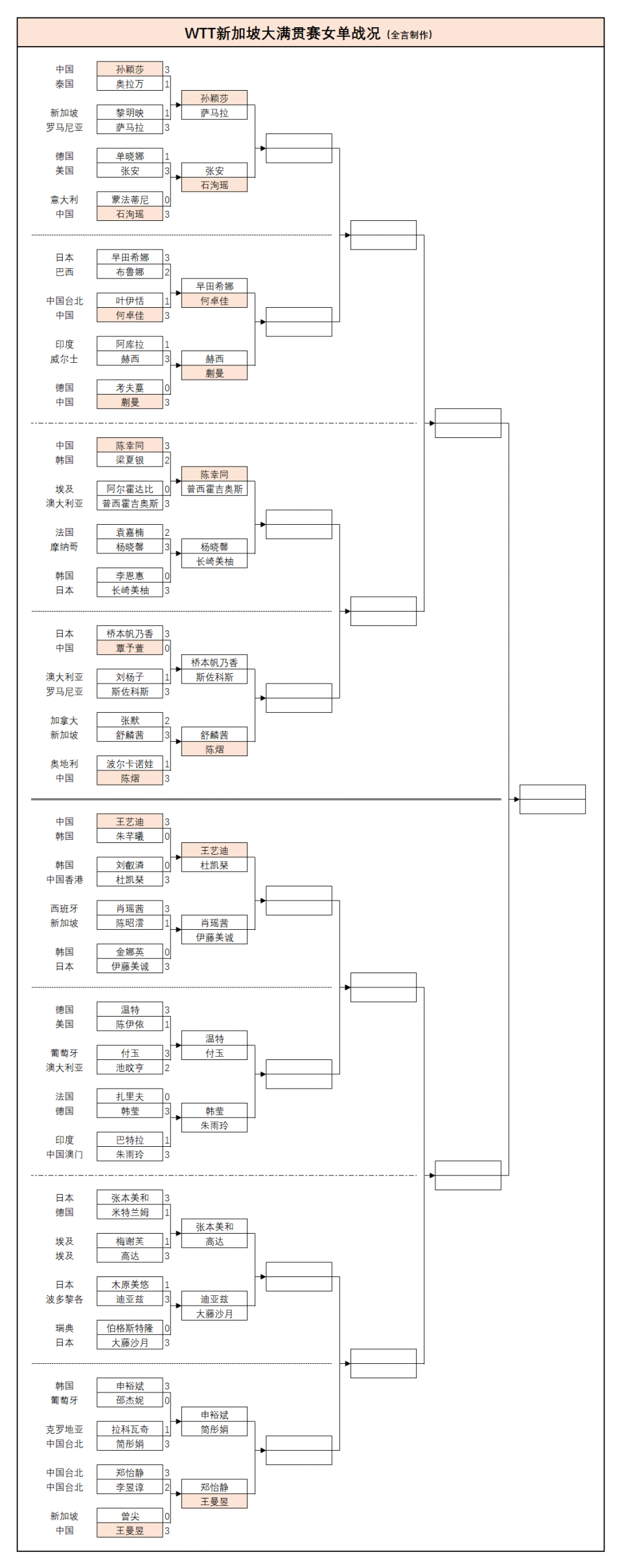 至于国乒另外6男8女则赢得了单打开门红的胜利,包括王楚钦、林诗栋、向鹏、周启豪、陈垣宇、黄友政以及孙颖莎、王曼昱、陈幸同、蒯曼、王艺迪、陈熠、石洵瑶、何卓佳,混双黄友政/陈熠也轻松过关,外协会松岛辉空/张本美和、林昀儒/郑怡静爆冷出局,各项详细战况如下: