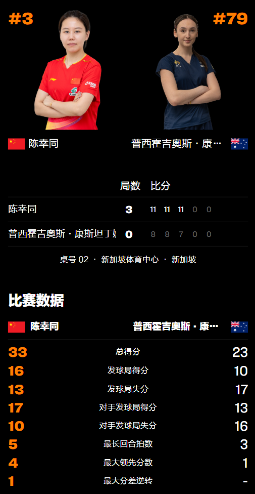 2026年2月24日,乒乓球WTT新加坡大满贯赛继续进行,国乒主力陈幸同发挥稳定轰3-0拿下澳大利亚运动员普西霍吉奥斯,由此而成为中国队第一位晋级女单16强的运动员——目前国乒在正赛第三天暂时取得3胜1负,有人欢喜有人愁,详细战况请看下文。