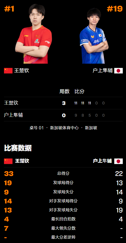 比赛开始后,王楚钦在首局就迅速发动连得4分,错失1球后又取得8-1领先的优势,在发接发环节占据非常大的优势,户上隼辅随后连得4分进行追赶,后半段王楚钦发球斜抛被挑战鹰眼,紧接着心态出现波动被追至9-8,紧接着10-8错失1个局点,好在最终还是以11-9惊险胜出。