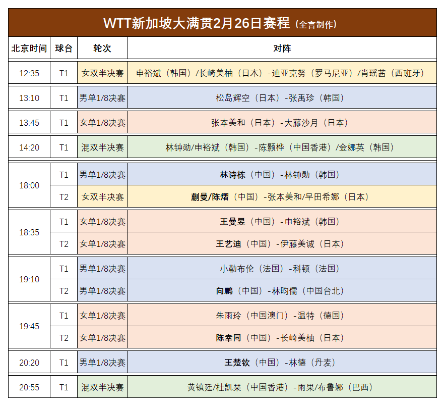 WTT新加坡大满贯:2月26日赛程公布!国乒再战伊藤、张本、早田