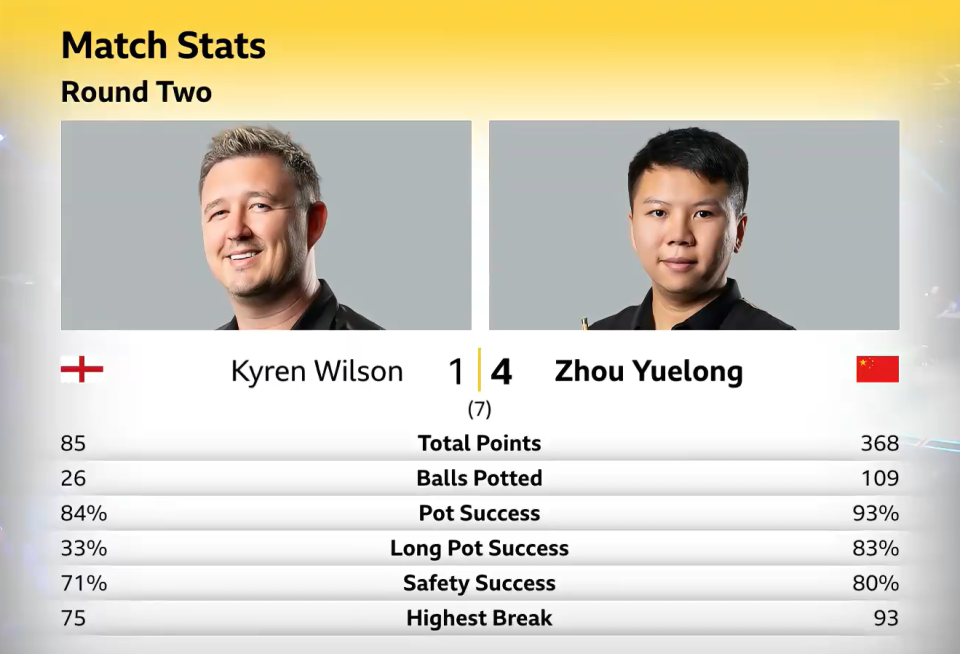 周跃龙最晚出场,挑战世界第二的囧哥凯伦·威尔逊。前三局,虽有一个简单球失误,但周跃龙长台表现很不错,打出两杆50+,3-0到赛点。囧哥单杆75分追回一局。第5局,囧哥拼球不进,大漏;周跃龙一杆72分完成超分,而后扎杆解进红球,4-1送走囧哥。