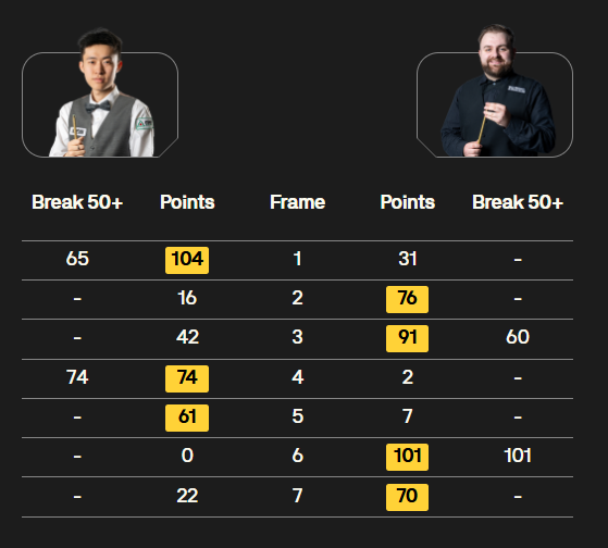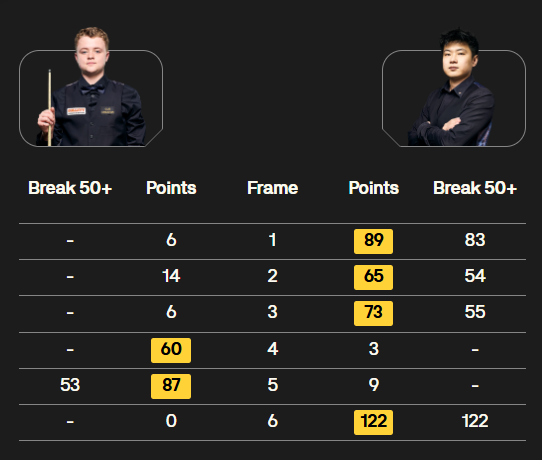 凌晨时段,赵心童出场对阵英国新星斯坦·穆迪。前三局,赵心童打出3杆50+,3-0到赛点。第4局,穆迪两次上手,扳回一分。第5局,穆迪两记长台、两次上手,再救一个赛点。第6局,赵心童一杆破百,4-2终结比赛。