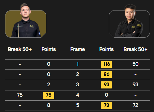 第二时段,庞俊旭2-4不敌霍金斯;德比战,江俊打出3杆50+、尾局单局逆转,4-0零封袁思俊。