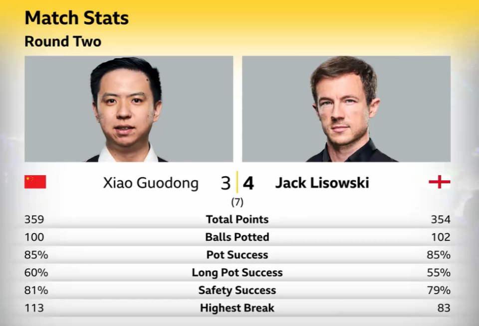 首时段,肖国栋对阵利索夫斯基。前4局,肖国栋打出两杆50+、第4局破百,3-1到赛点。随后,利索夫斯基扳平比分。决胜局,可以说是本场比赛的缩影,双方失误不断,肖国栋多次错失机会,最后遭利索夫斯基逆转。