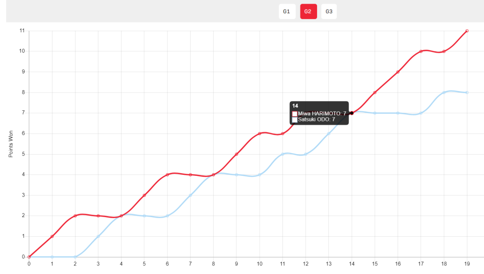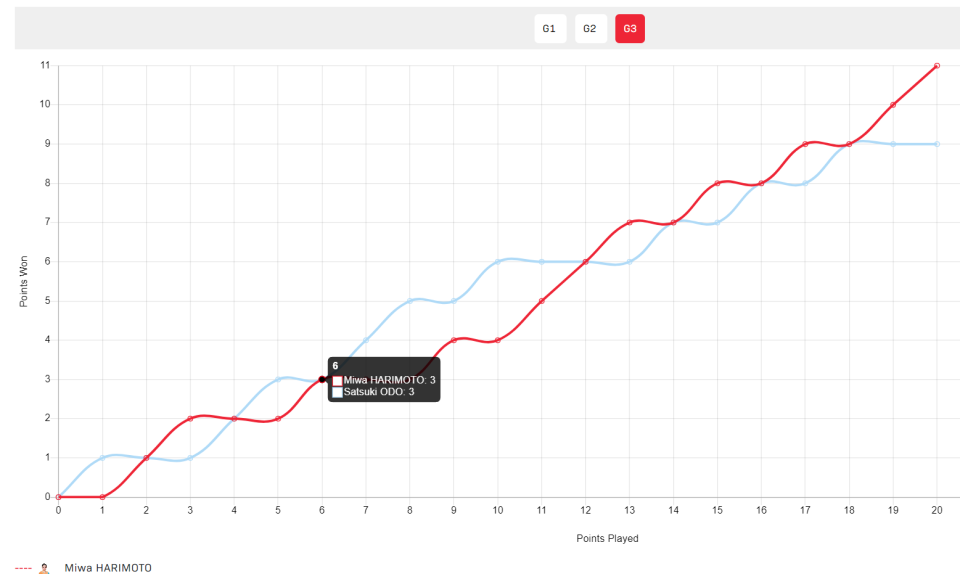 第三局对于大藤沙月来说就是生死一线,随后2-2、3-3,大藤沙月6-4领先,张本美和追到6-6,随后两人鏖战7-7、8-8、9-9,张本美和11-9直落三局拿下胜利。