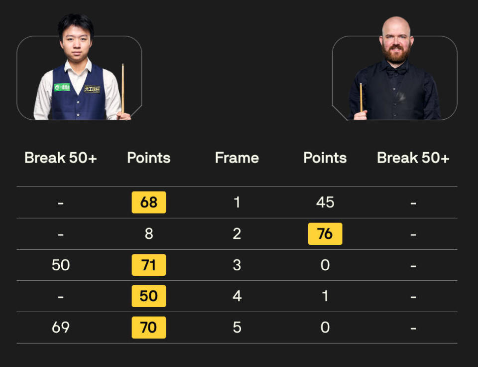 下一轮,江俊将对阵吴宜泽与大卫-格雷斯之间的胜者。