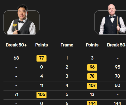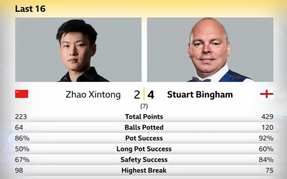第5局,宾汉姆打丢一杆制胜机会,赵心童准度回暖,一杆98分清台,扳回一分。第6局,宾汉姆两次打丢制胜机会,但赵心童也是出现两个失误。最后,宾汉姆通过斯诺克获机会,第三次上手,锁定胜局,4-2获胜,终止赵心童的连胜。