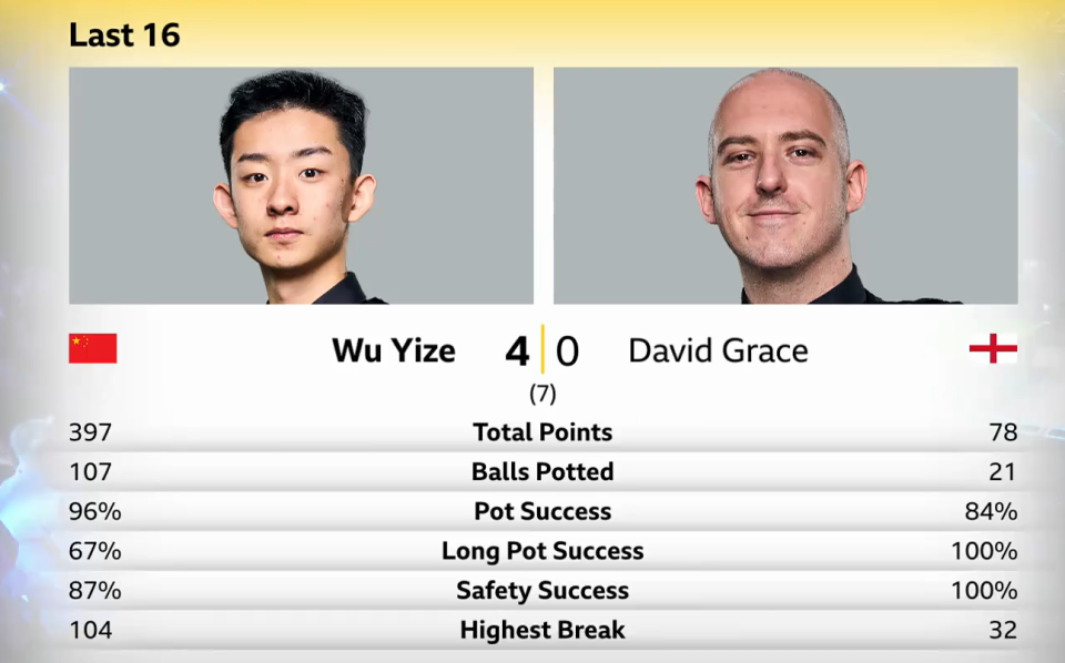 第二时段,吴宜泽出场对阵大卫·格雷斯。首局,格雷斯手握62分打丢黑球,吴宜泽一杆78分单局逆转。随后,吴宜泽打出单杆71分和破百,3-0到赛点。第4局,吴宜泽单杆70分后打丢简单超分球,不过吴宜泽最后长台准进超分红球,4-0速胜晋级。