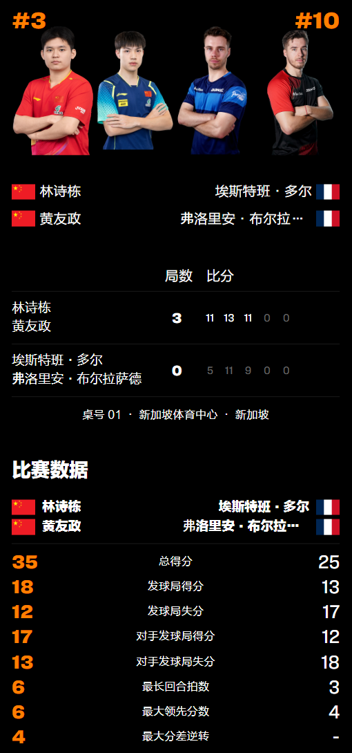 WTT新加坡大满贯:国乒首个决赛席位诞生!林诗栋/黄友政大获全胜