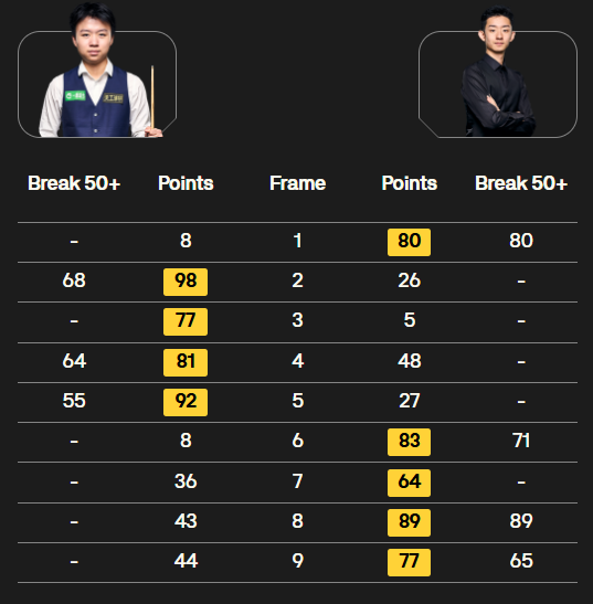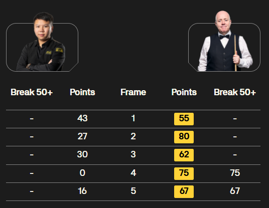 同时段,周跃龙对阵希金斯,比赛一边倒。前3局,进程很慢,希金斯在防守上压制,3-0领先。第4局,希金斯单杆75分制胜,4-0到赛点。