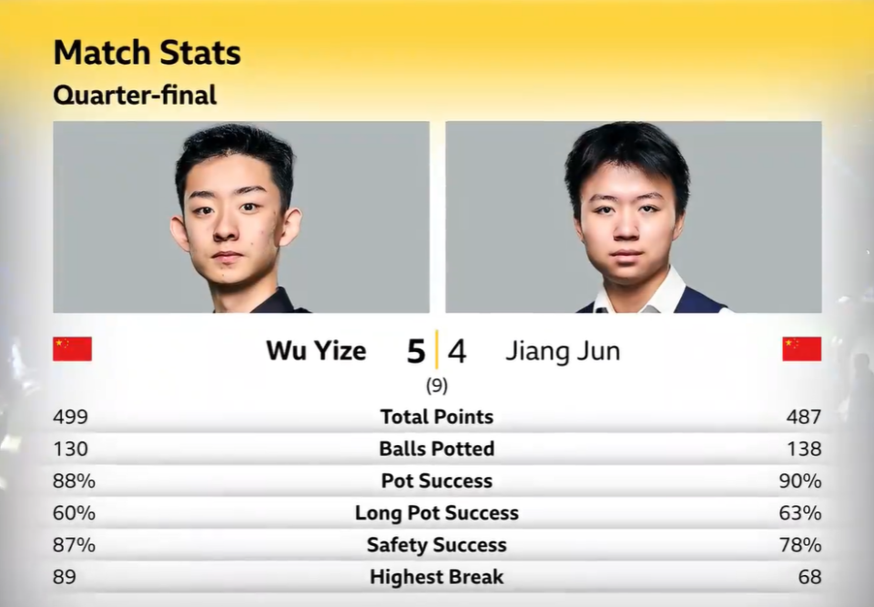 有点可惜啊,江俊错失首次杀入半决赛的好机会。吴宜泽前面准度频频跑偏、挖个大坑,所幸后面状态有所回暖。