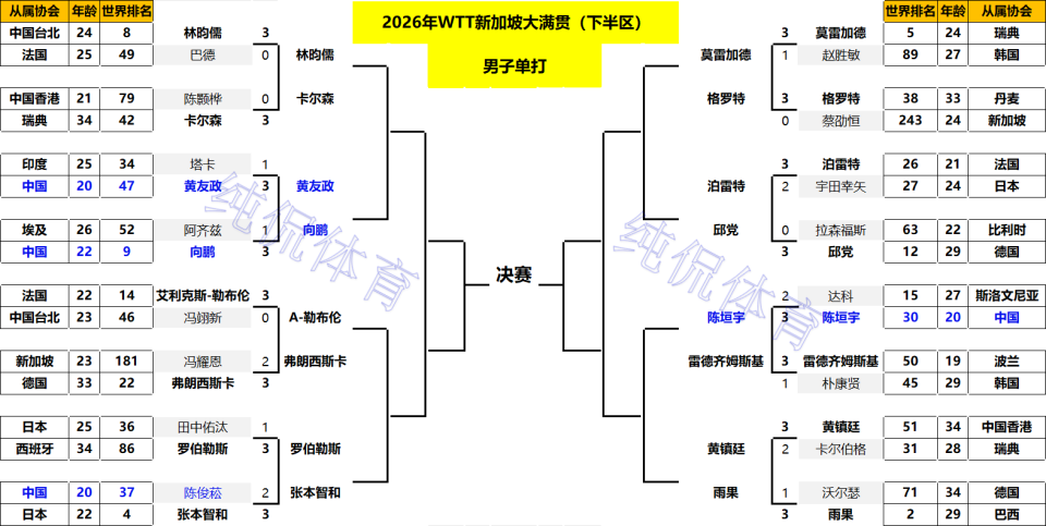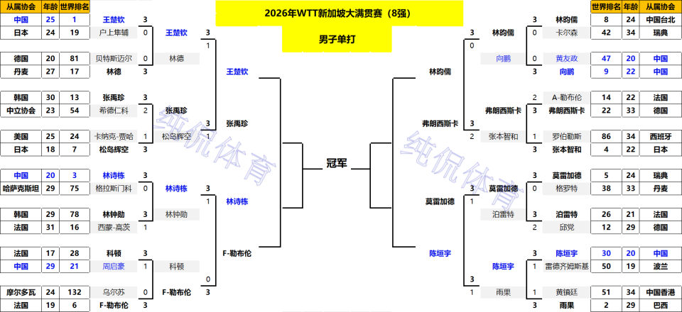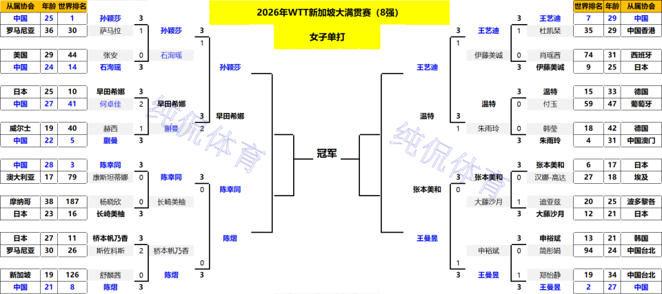 北京时间2月27日晚,2026年WTT新加坡大满贯结束了正赛第7天的争夺,目前单打八强正式出炉(详细签表如下图所示)!男单八强国乒占3席,女单八强国乒占5席;日乒男单参赛6人全军覆没;韩国单打参赛14人仅剩张禹珍独苗,下面带来详细信息。