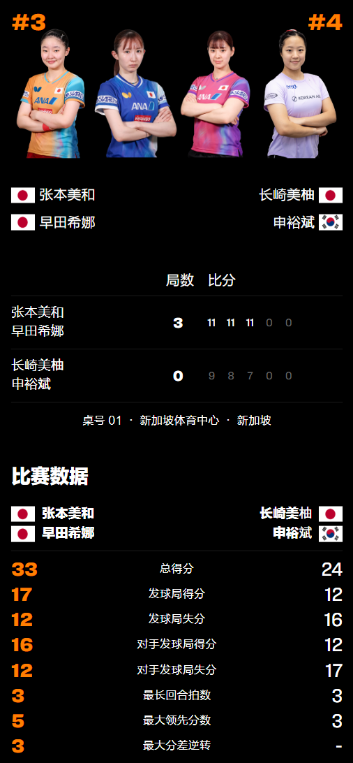 第三局张本美和/早田希娜再次发威,开局就3-1领先逼长崎美柚/申裕斌用掉暂停机会。暂停结束后,日本组合再接再厉取得8-4、9-5、10-6领先拿到赛点,错失1分后稳住阵脚以11-7拿下,由此而大比分3-0横扫对手登顶为王。