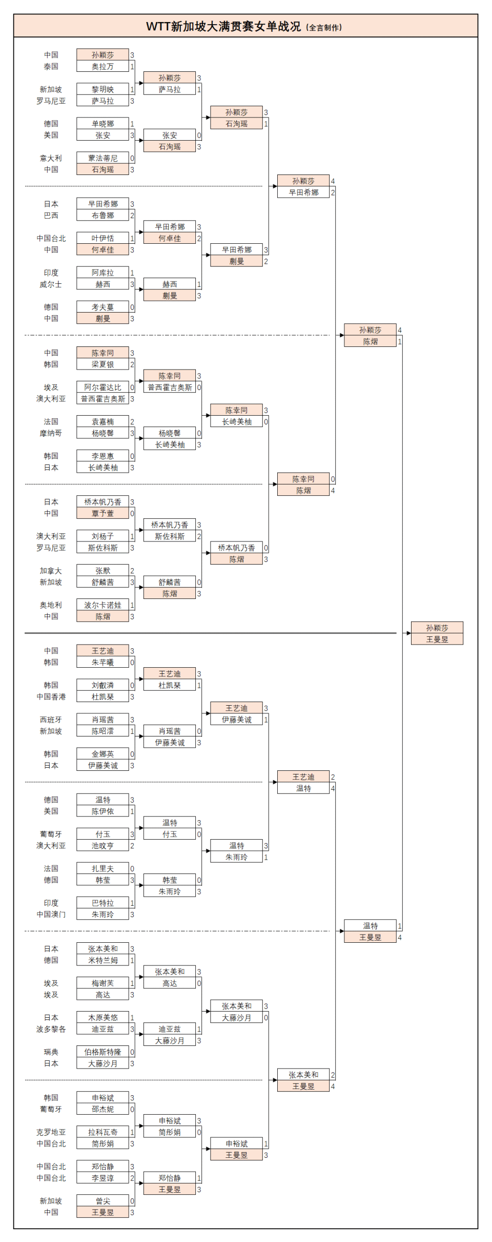 孙颖莎:3-1奥拉万(泰国)、3-1萨马拉(罗马尼亚)、3-1石洵瑶(中国)、4-2早田希娜(日本)、4-1陈熠(中国)。