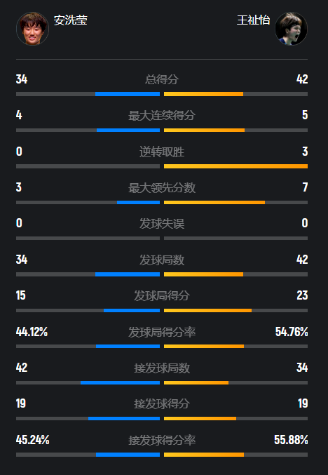第二局比赛王祉怡延续了火热的状态,开局就以5-2压制住了安洗莹,但不能再输的韩国天才少女,很快就发起了疯狂的反扑,通过控网后撤步劈杀,迅速将比分反超为了9-6,但王祉怡用高质量的四方拉吊成功给比赛降速,如愿以11-10结束了前半局的争夺。