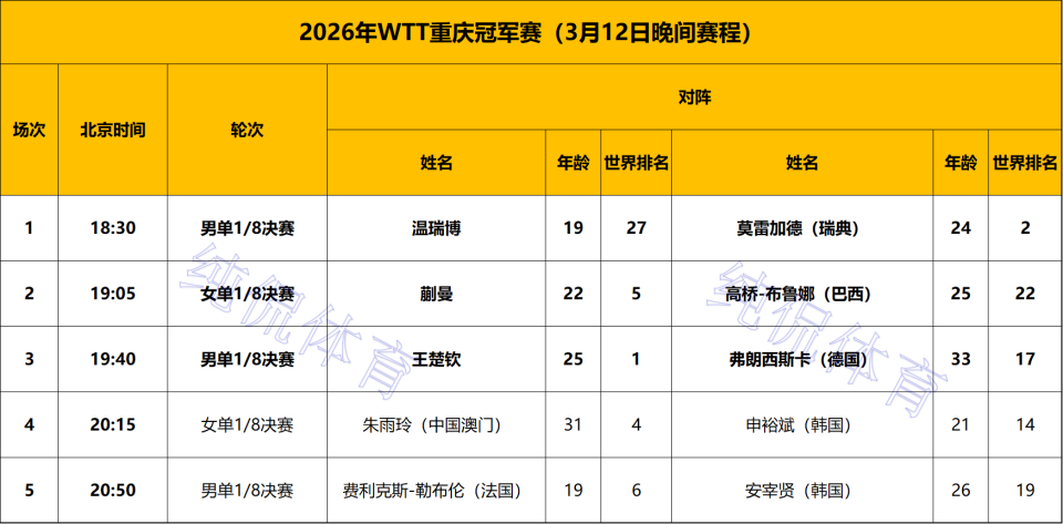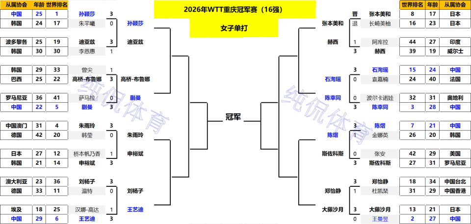 北京时间3月12日,2026年WTT重庆冠军赛进入第3个比赛日的争夺,在白天场次结束之后,男、女单16强正式出炉!本人详细整理了对阵签表,如下图所示。国乒单打14人已有4人出局;日乒8人有5人晋级;韩国男、女单均剩独苗,下面带来详细信息。