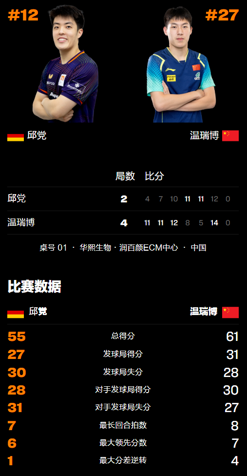 比赛开始后,两位运动员因为此前没有交手过,所以在首局打得比较谨慎,但中间段温瑞博逐渐适应了邱党的球路,随后打出了横拍运动员对直拍选手的优势,压反手、调正手非常成功,很快便拿到6个局点并最终以11-4轻松拔得头筹。