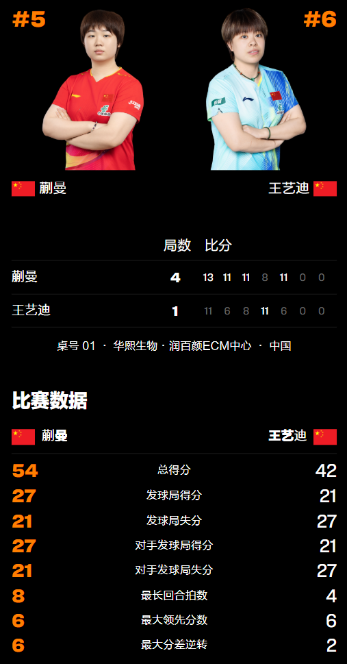 本站比赛两位运动员的表现都非常显眼,尤其蒯曼在1/4决赛中淘汰了世界排名第1的队友孙颖莎晋级,状态非常不错。而在此之前,王艺迪对蒯曼的国际比赛交手记录相对上风,取得了2胜1负的战绩,不过最近的较量败给了对方,如今再次相遇依旧胜负难料。