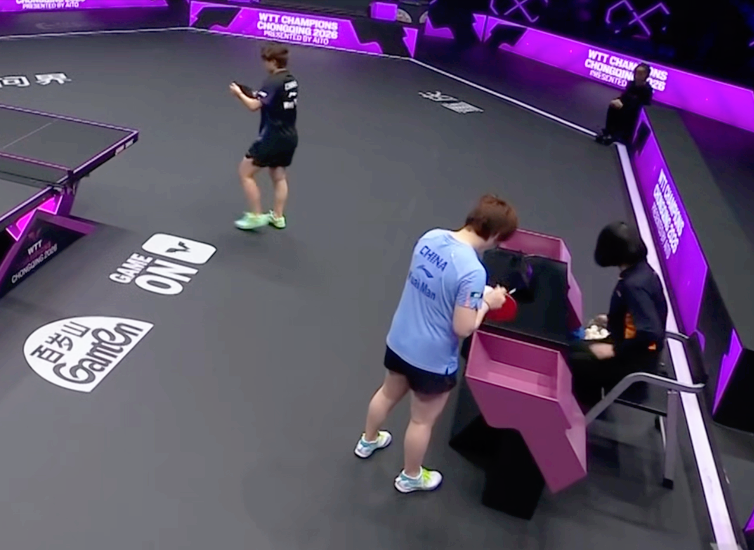 第五局王艺迪依旧增加回球质量得分领先队友,蒯曼则在0-2落后的情况下通过反手搓球控制对方的抢攻,继而转两条线快拉强势破防,很快便以8-2、9-3反超夺回场上的主动权,紧接着10-5领先拿到5个赛点,随后被打退台放高球错失1分后叫出暂停进行调整。
