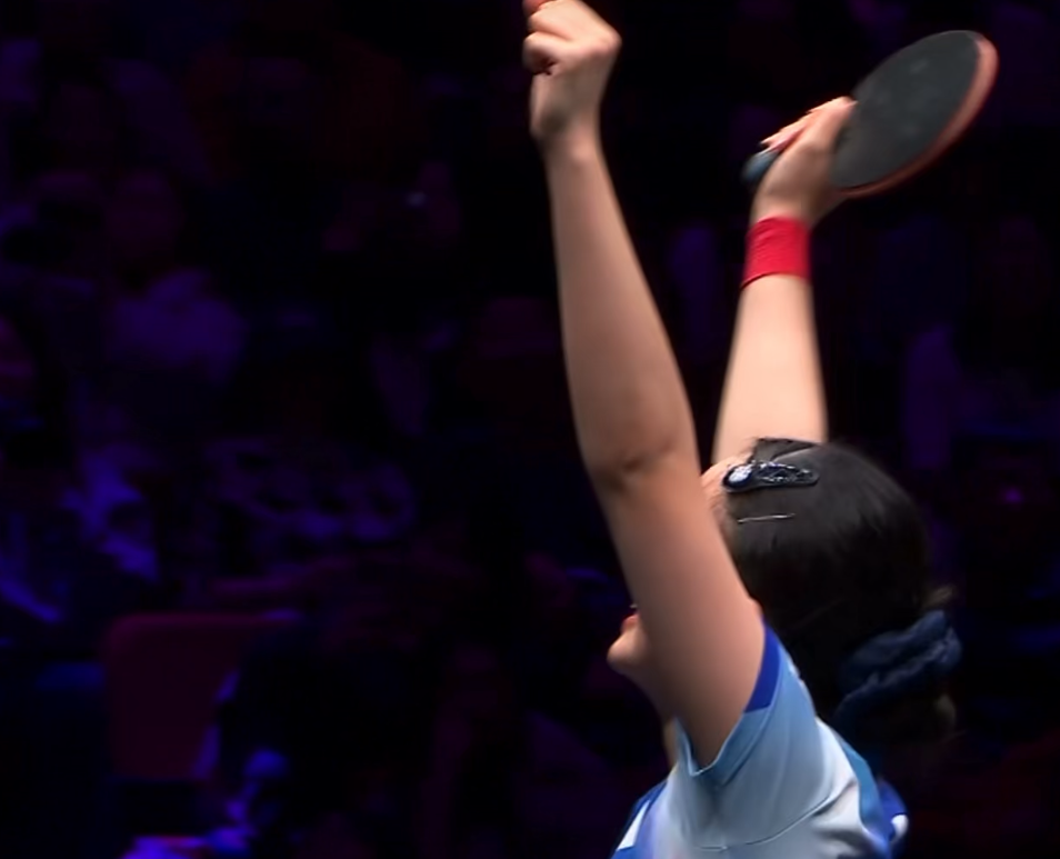 夺冠之后,张本美和第一时间高举上手,以此来庆祝这场比赛的胜利。