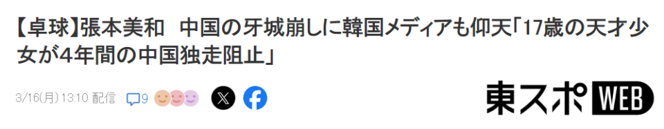 韩国媒体指出,此前在中国举办的同系列女子赛事,过去冠军均由中国选手包揽,张本美和的胜利给中国乒坛带来了巨大冲击。日媒强调称,攻破中国堡垒、拿下重大胜利的张本美和,在海外也收获了极高关注。