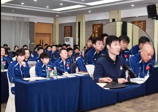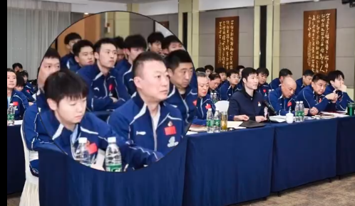 会议的主题是:专题学习 + 赛前誓师,以两会精神为引领,直面重庆赛失利,部署 40 天封闭集训,备战澳门世界杯(3.30—4.5)与伦敦世乒赛(4.28—5.10)