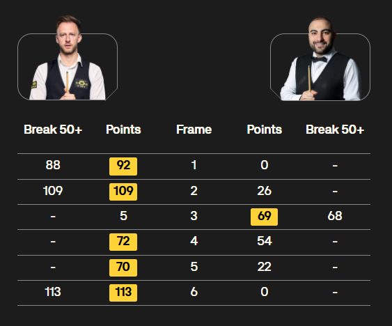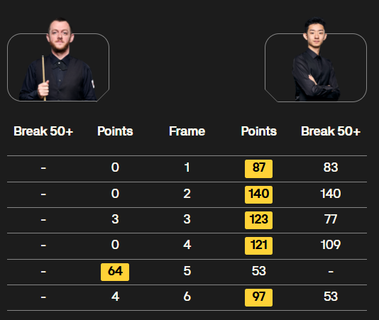 前4局,艾伦只进了两颗球,得了3分。短休后,第5局,吴宜泽错失提前结束比赛的机会,有点无心恋战的艾伦,单局逆转挽救一个赛点。第6局,吴宜泽单杆53分后失误,但艾伦再送机会,吴宜泽5-1终结比赛,大胜艾伦。
