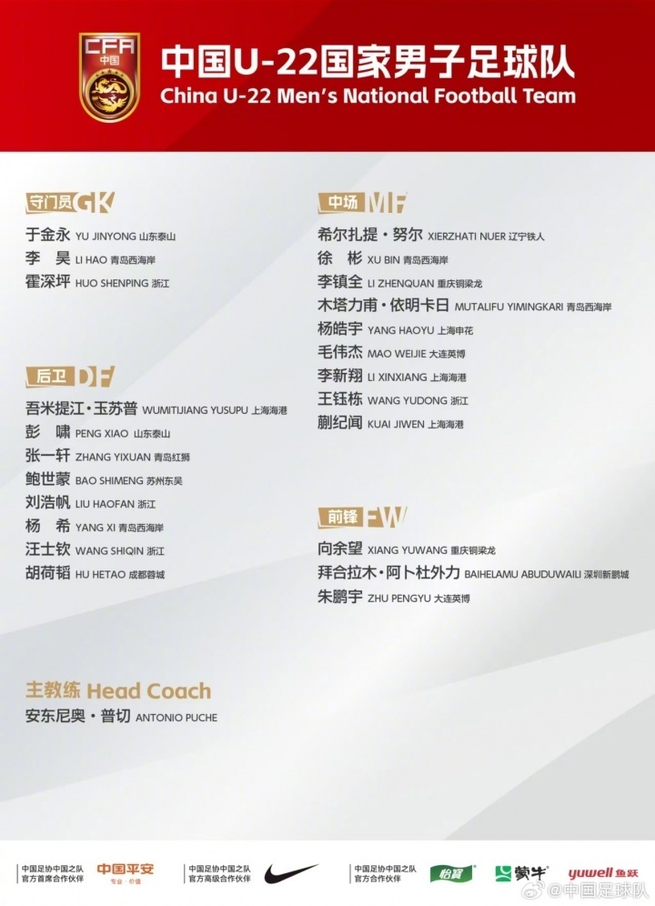 值得一提的是,这支U22国足召入了王钰栋、胡荷韬、拜合拉木、于金永、汪士钦、刘浩帆、吾米提江、蒯纪闻、徐彬9名入选过国足的球员。