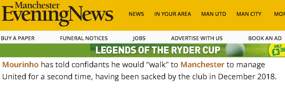 《曼彻斯特晚报》:穆帅愿意走路去执教曼联
