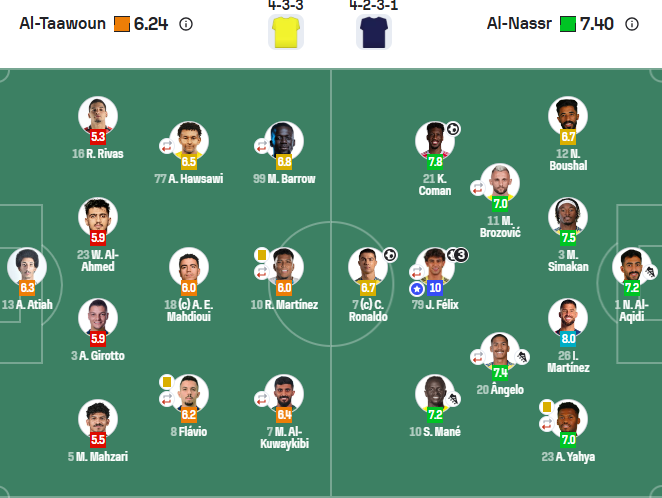 利雅得胜利:1-纳瓦夫-阿奇迪、12-纳瓦夫、3-西马坎、26-伊尼戈、23-叶海亚、20-安吉洛、11-B罗、79-菲利克斯、21-科曼、10-马内、7-C罗