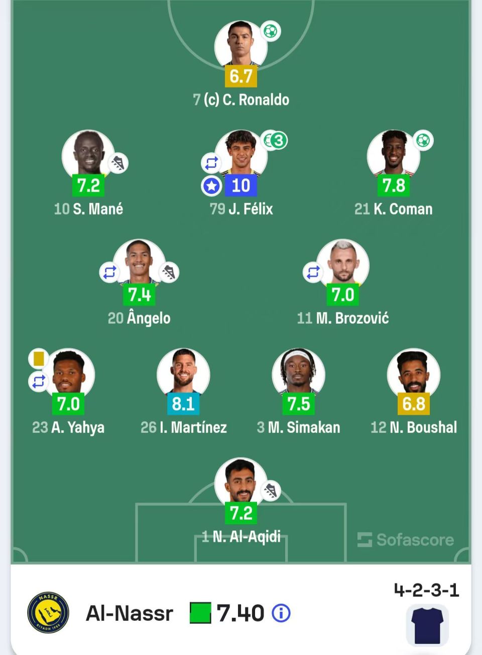 全场比赛,C罗完成了8脚射门,最终2次打在门框范围内,3次被封堵以及3次打在门框范围外。此外C罗还有3次关键传球。不过,C罗本场比赛只得到了6.7分,是全队得分最低的球员。