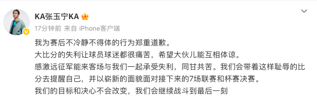 张玉宁写道:“我为赛后不冷静不得体的行为郑重道歉。大比分的失利让球员球迷都很痛苦,希望大伙儿能互相体谅。感激远征军能来客场与我们一起承受失利,同甘共苦。”