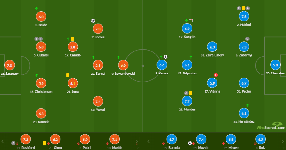 巴黎圣日耳曼(4-3-3):舍瓦利耶;阿什拉夫,帕乔,扎巴尔尼,努诺·门德斯;法维安-鲁伊斯(72'贡萨洛-拉莫斯),维蒂尼亚,若昂-内维斯;姆巴耶(65'卢卡斯-埃尔南德斯),马尤卢(80'恩杰恩图),巴尔科拉(80'李刚仁)