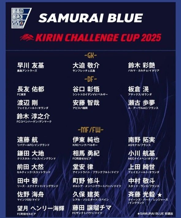早川友基(鹿岛鹿角)、大迫敬介(广岛三箭)、铃木彩艳(帕尔马)、长友佑都(东京FC)、谷口彰悟(圣图尔登)、板仓滉(阿贾克斯)、渡边刚(费耶诺德)、安藤智哉(福冈黄蜂)、濑古步梦(勒阿弗尔)、铃木淳之介(哥本哈根)远藤航(利物浦)、伊东纯也(亨克)、南野拓实(摩纳哥)、镰田大地(水晶宫)、相马勇纪( 町田泽维亚)、小川航基(奈梅亨)、前田大然(凯尔特人)、堂安律(法兰克福)、上田绮世(费耶诺德)、田中碧(利兹联)、町野修斗(门兴)、中村敬斗(兰斯)、佐野海舟(美因茨)、久保建英(皇家社会)、齐藤光毅(女王公园巡游者)、望月海辉(町田泽维亚)、藤田让瑠-奇马(圣保利)