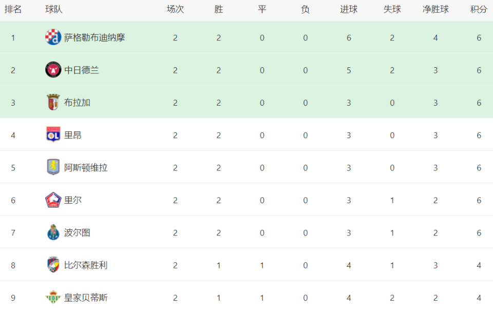 在积分榜上,萨格勒布迪纳摩、中日德兰、布拉加、里昂、阿斯顿维拉、里尔和波尔图都是2战全胜,拿到6个积分。皇家贝蒂斯4分。塞尔塔、罗马和斯图加特都是3分。诺丁汉森林、博洛尼亚和凯尔特人都是1分。