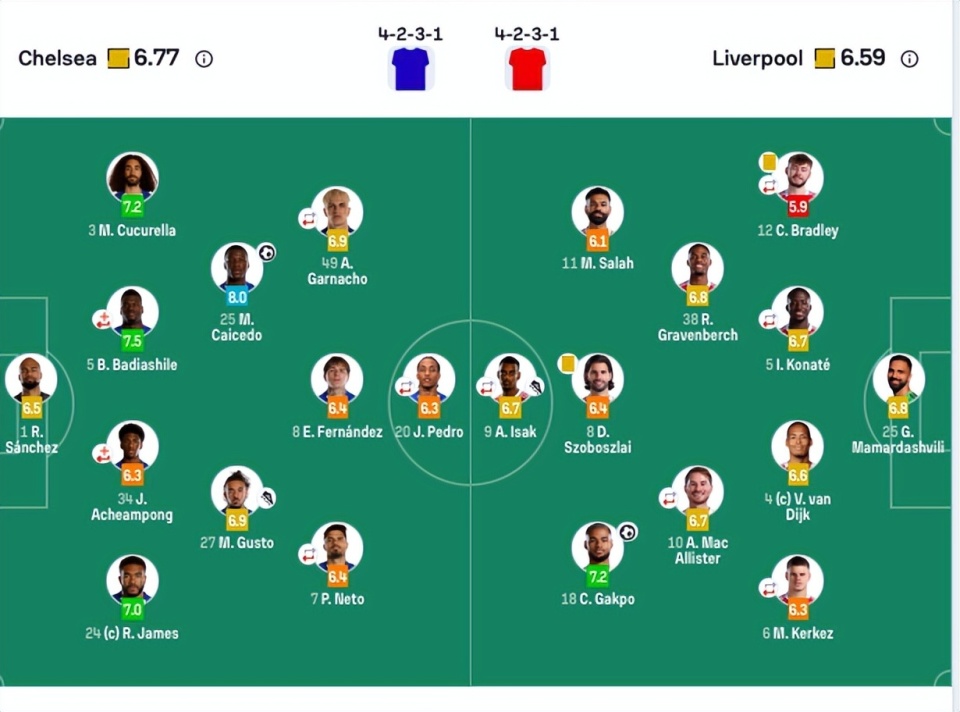 利物浦首发:25-玛玛达什维利、6-科尔克兹(55’26-罗伯逊)、4-范迪克、5-科纳特(55’17-琼斯)、12-布拉德利(7-维尔茨)、38-赫拉芬贝赫、10-麦卡利斯特(87’3-远藤航)、8-索博斯洛伊、18-加克波、11-萨拉赫、9-伊萨克(74’22-埃基蒂克)。