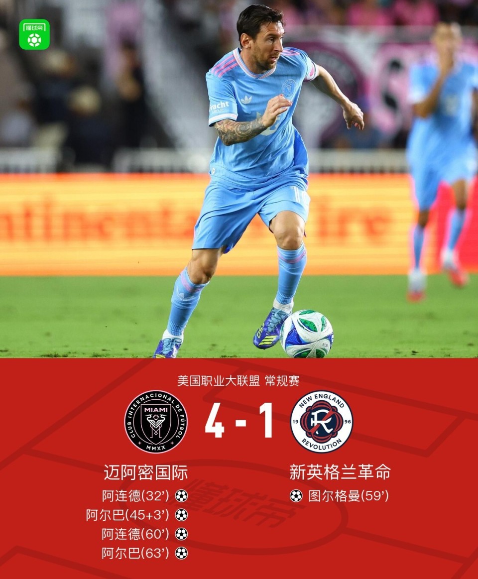 美职联:迈阿密国际4-1新英格兰革命,梅西助攻戴帽,阿尔巴2球