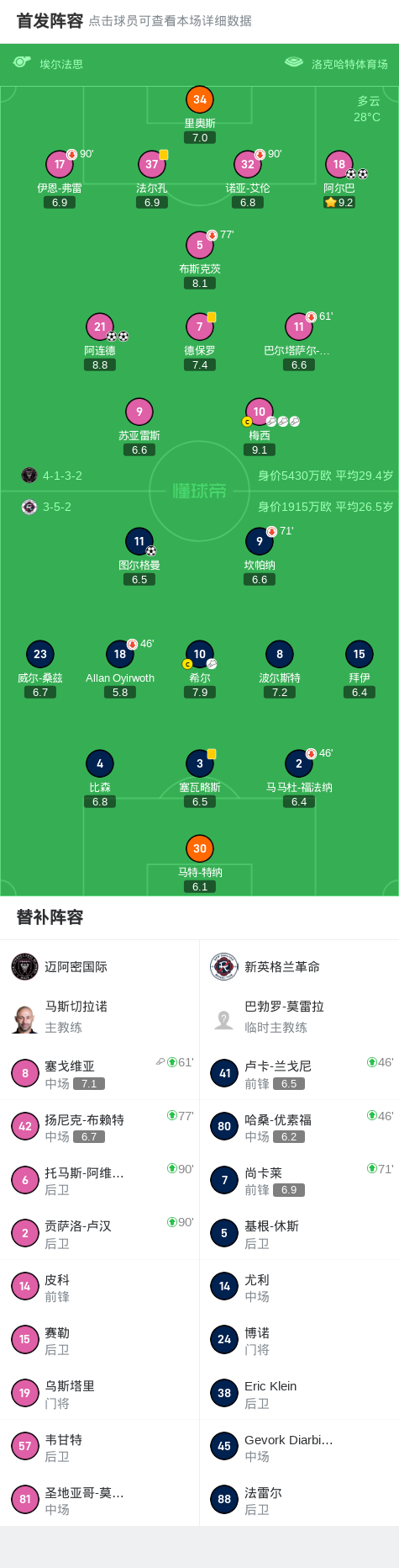 第77分钟,迈阿密换人,布斯克茨被换下,布赖特替补登场