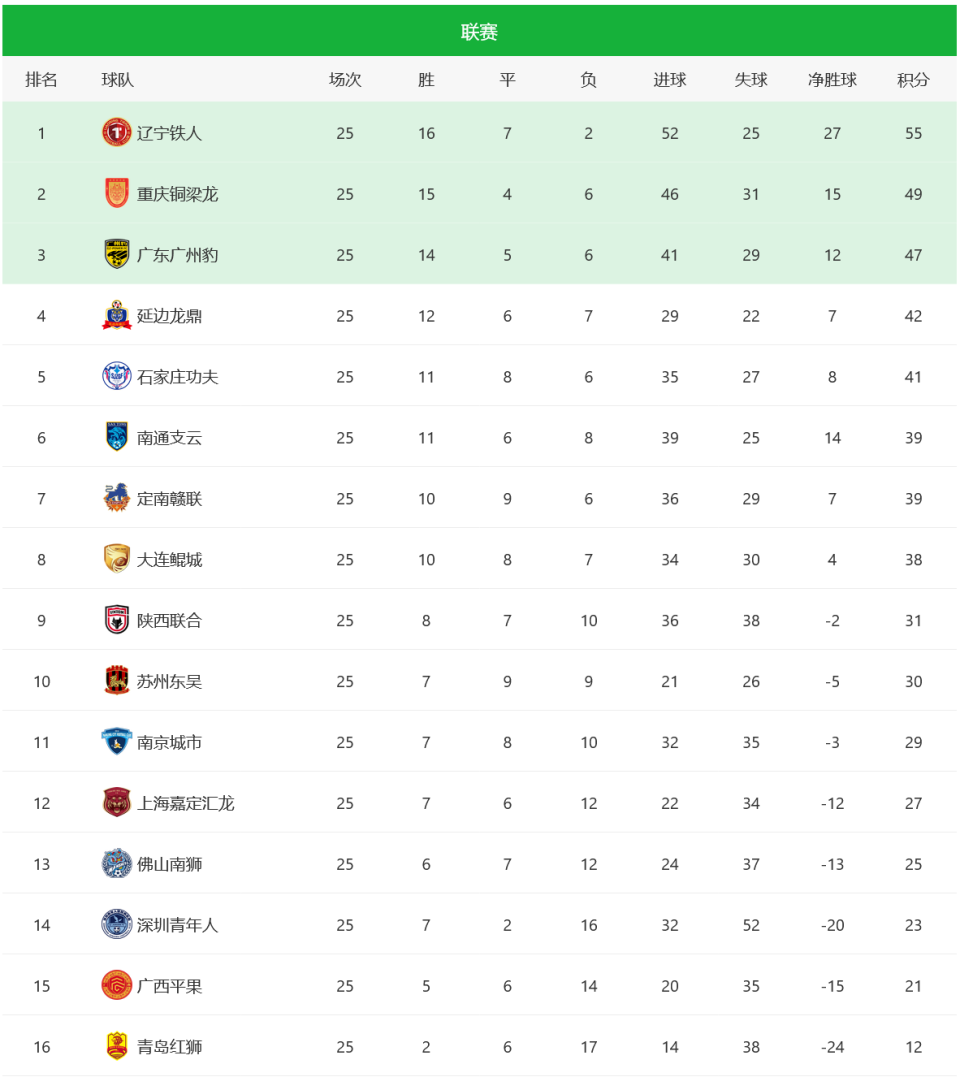 辽宁铁人结束3轮不胜,总积分提升到55分,领先第三名仍有8分优势,冲超指日可待。苏州东吴连胜被终结,目前积30分混迹中游,领先降级区9分保级压力不大。