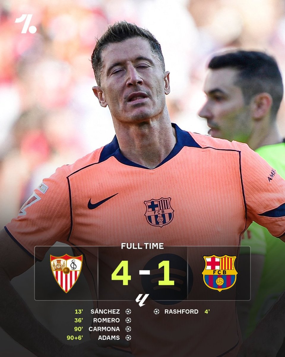 西甲第8轮,巴萨客场1-4塞维利亚,各项赛事遭遇两连败,距榜首2分。阿劳霍送点,桑切斯点射命中,伊萨克-罗梅罗再下一城,佩德里助攻拉什福德扳回一球,巴尔德造点,莱万罚失点球,卡尔莫纳进球,阿尔科-亚当斯锁定胜局。【详情】