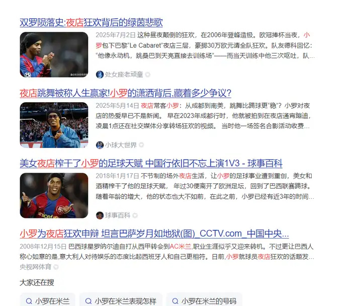 关于小罗在夜店的故事,大家在网上可以搜相关新闻,这里就不再详细阐述。他去夜店的那些故事,从巴萨再到米兰,事情的话是非常多。