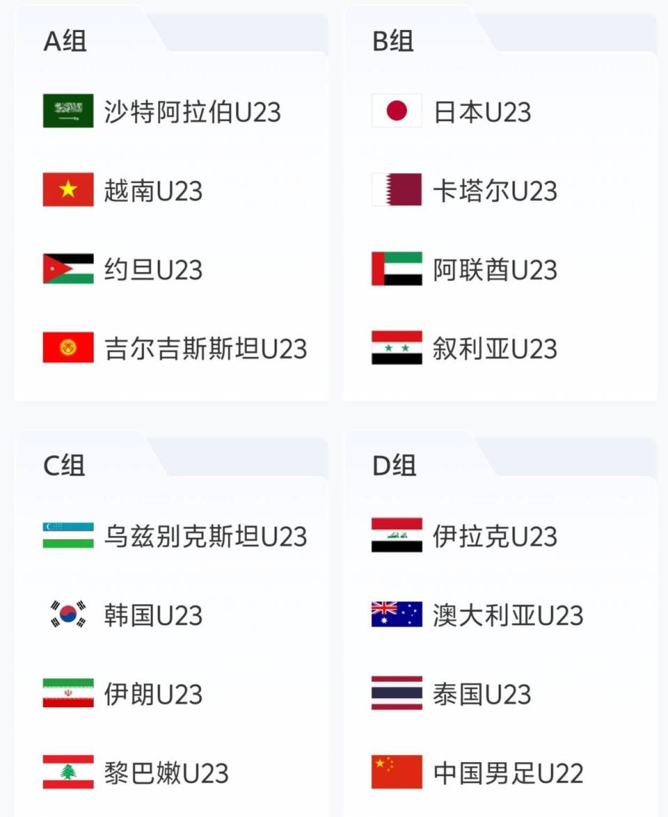 2026年沙特阿拉伯U23男足亚洲杯抽签结果引发日韩媒体关注。中国U23作为第四档球队,与伊拉克队、澳大利亚队、泰国队同分在D组。16支球队被分入四个小组,各小组前两名将晋级八强。其余三个小组中,东道主沙特队与越南、约旦、吉尔吉斯斯坦队被分入A组;日本、卡塔尔、阿联酋和叙利亚队被分入B组;C组则有乌兹别克斯坦、韩国、伊朗和黎巴嫩队。本届赛事将于2026年1月7日至25日在沙特阿拉伯举行。