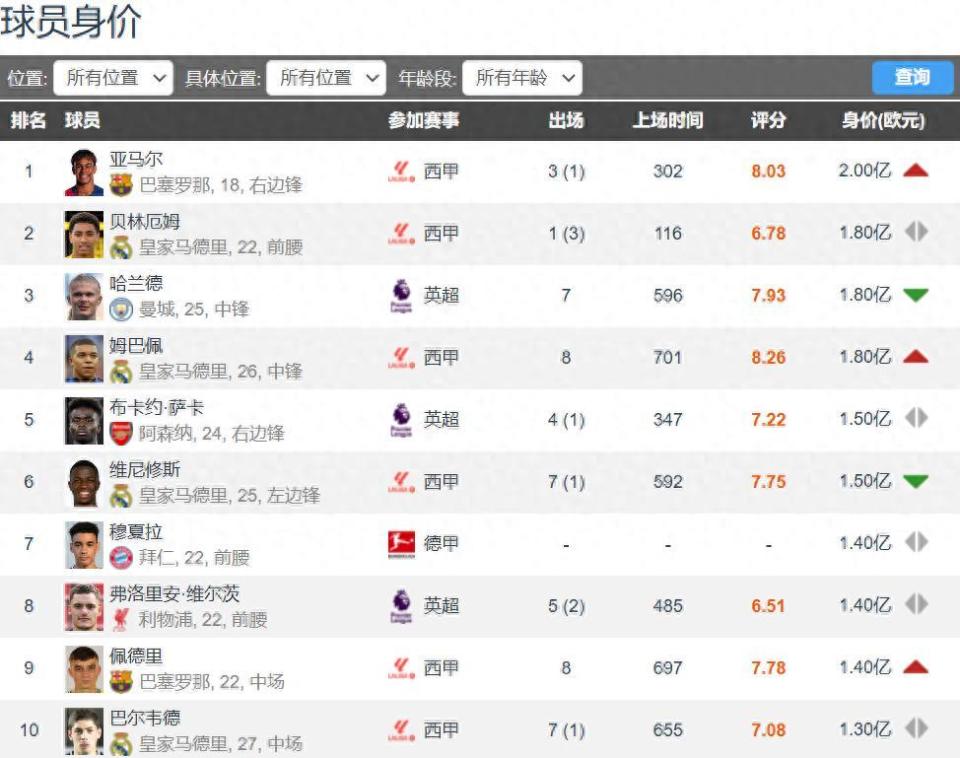 西甲7人:亚马尔2亿欧元、姆巴佩1.8亿欧元、贝林厄姆1.8亿欧元、维尼修斯1.5亿欧元、佩德里1.4亿欧元、巴尔韦德1.3亿欧元、阿尔瓦雷斯1亿欧元。